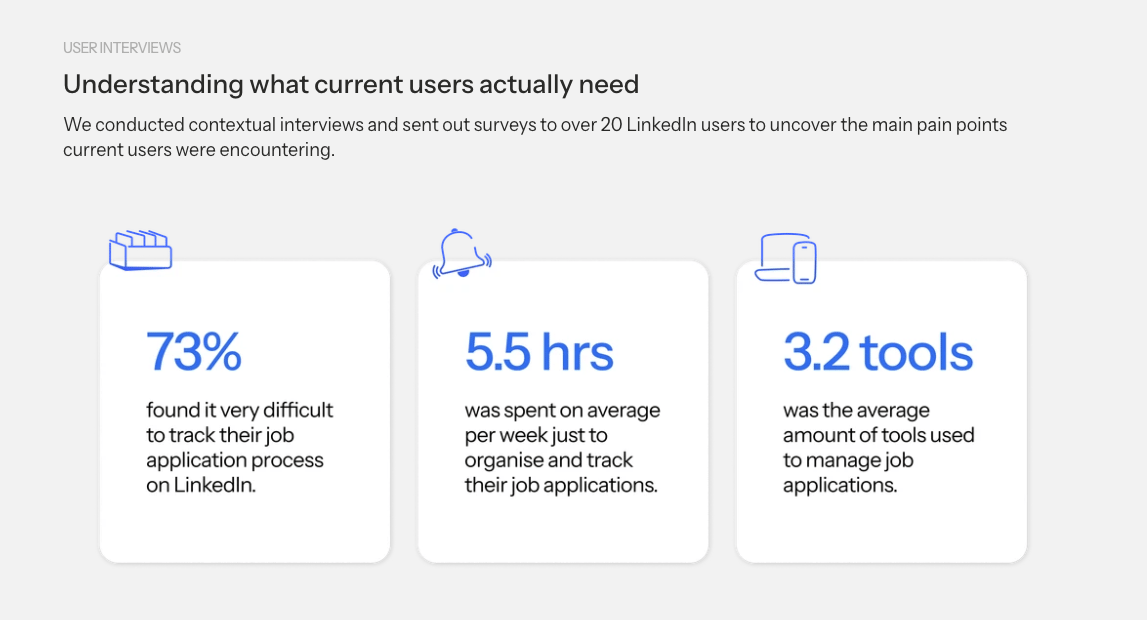 In her LinkedIn Workboard case study, for instance, she summarizes the outcome of 20+ user interviews not through walls of text or unreadable FigJam boards, but through three well-designed cards that highlight the key insights and how they shaped the direction of the project. This is exactly the kind of storytelling that signals maturity — not because it hides process, but because it distills it.