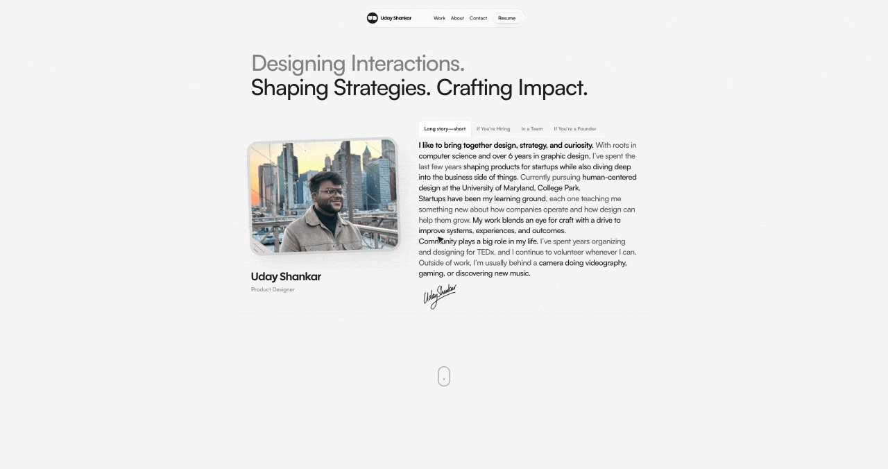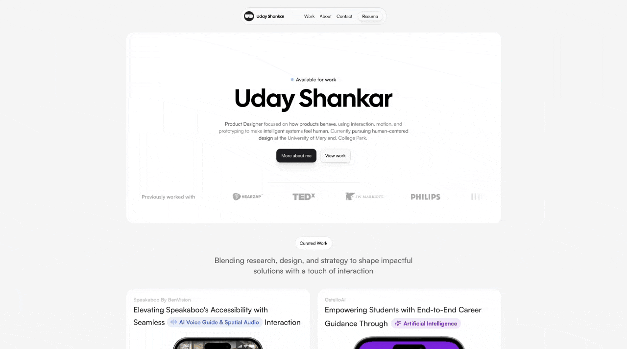 The strongest first impression of Uday’s portfolio is simply how good it feels to interact with.