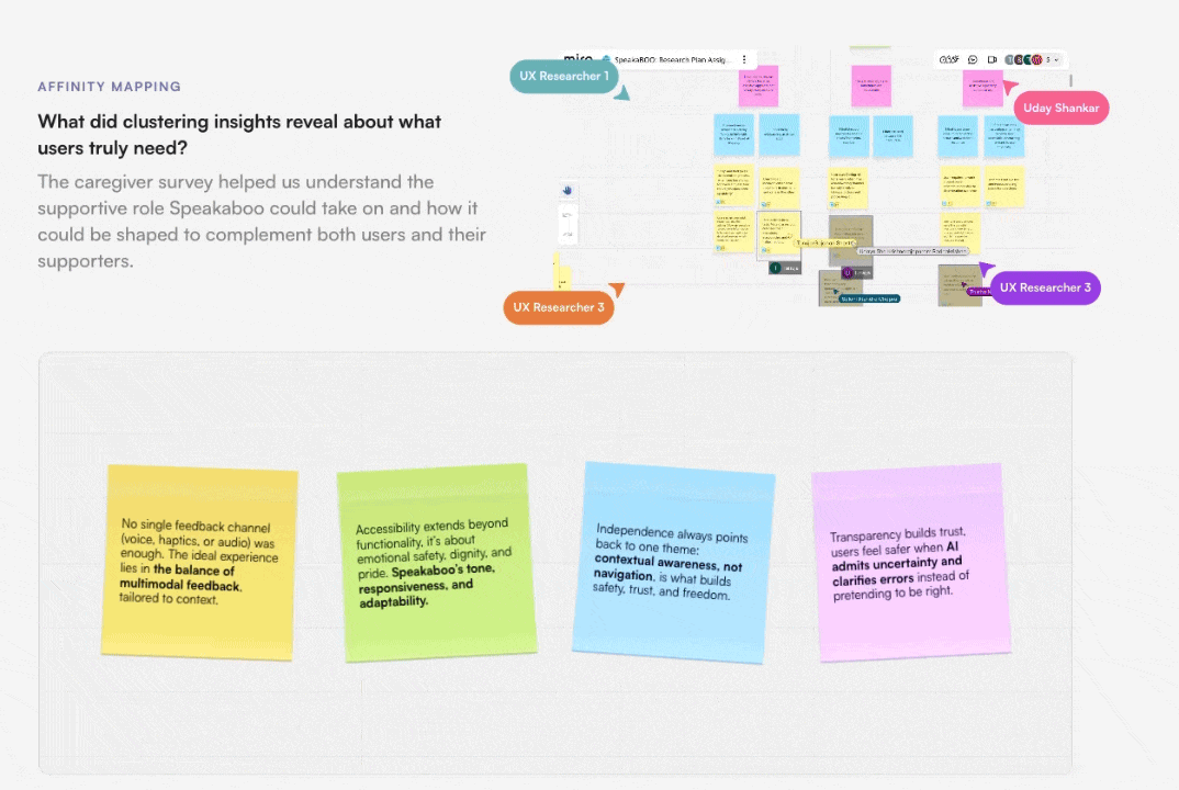 Take the Speakaboo case study, for example. When he describes the affinity mapping stage, he includes a subtle video showing collaborators interacting on a Miro board. The video itself isn’t the main point — the real takeaway is summarized clearly underneath with four well-designed sticky notes highlighting key insights.