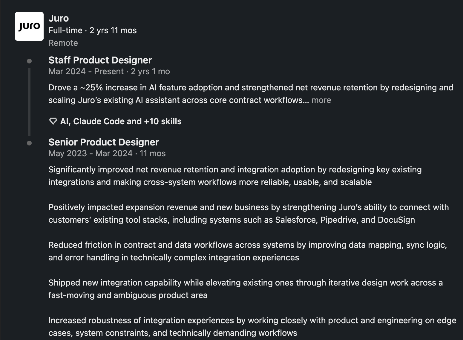 If design systems are important to your profile and your work actually supports that, include them. If you work with Framer or have relevant front-end knowledge, that can also make sense. If you’re targeting a certain kind of role and there are recurring keywords in job descriptions for that role, pay attention to those too.