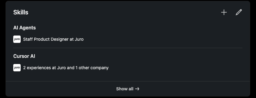 If your profile says “design systems” and none of your experience mentions anything remotely related to design systems, that probably won’t help much. You might get surfaced in a search, but people don’t stop at the skills section. They will look at the rest of your profile too.